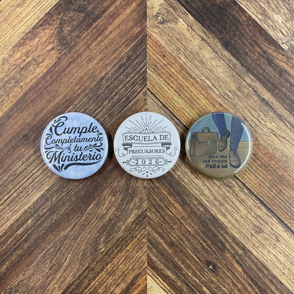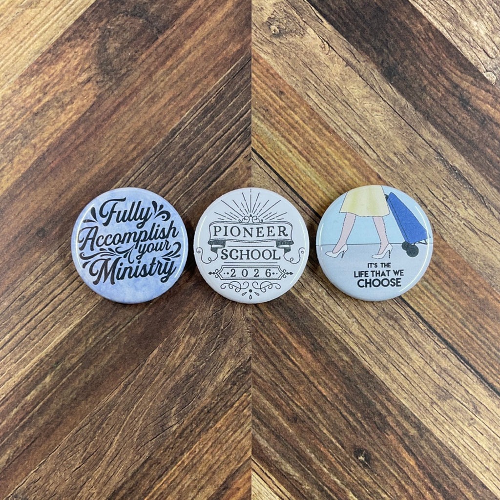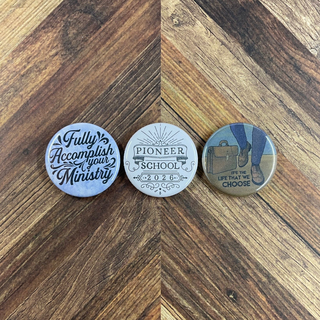 Includes: 3 - 1 1/4” Button Pins or Magnets (Fully Accomplish Your Ministry, Pioneer School 2026, and Life That We Choose-pick for brother or sister)