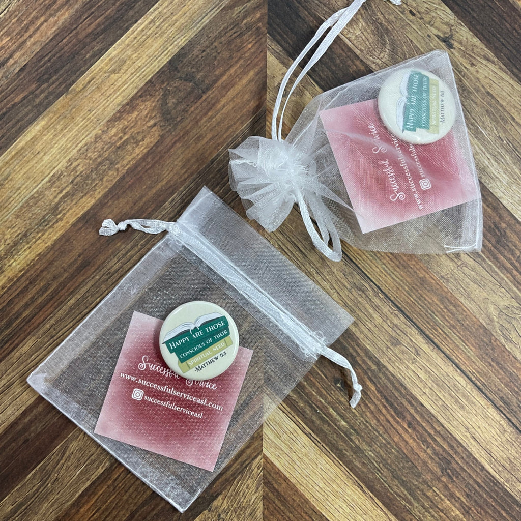 Each button measures 1.25”. Select either button pin or magnets when adding to cart. Available in packs of 5, 10, 20, or 50, these buttons come individually packed in organza bags, ready to be gifted! (Organza bag color may vary) Please allow for a slight variation in color due to lighting and your screen display.
